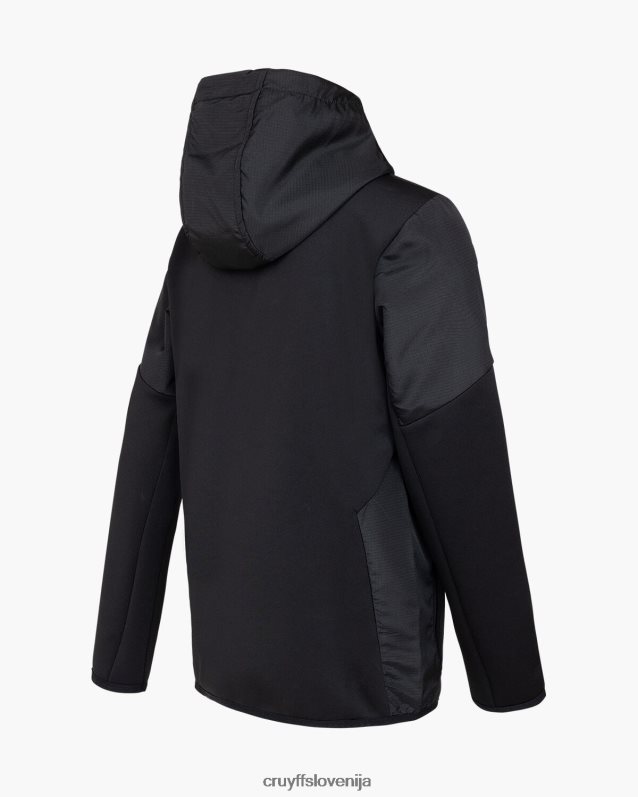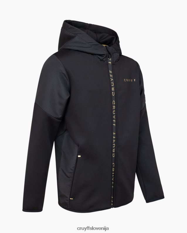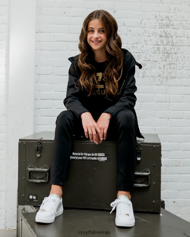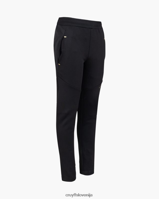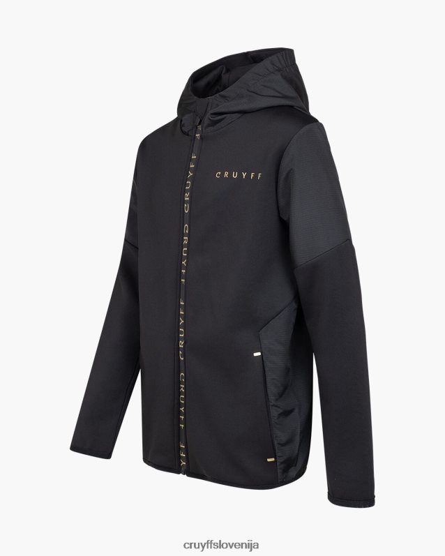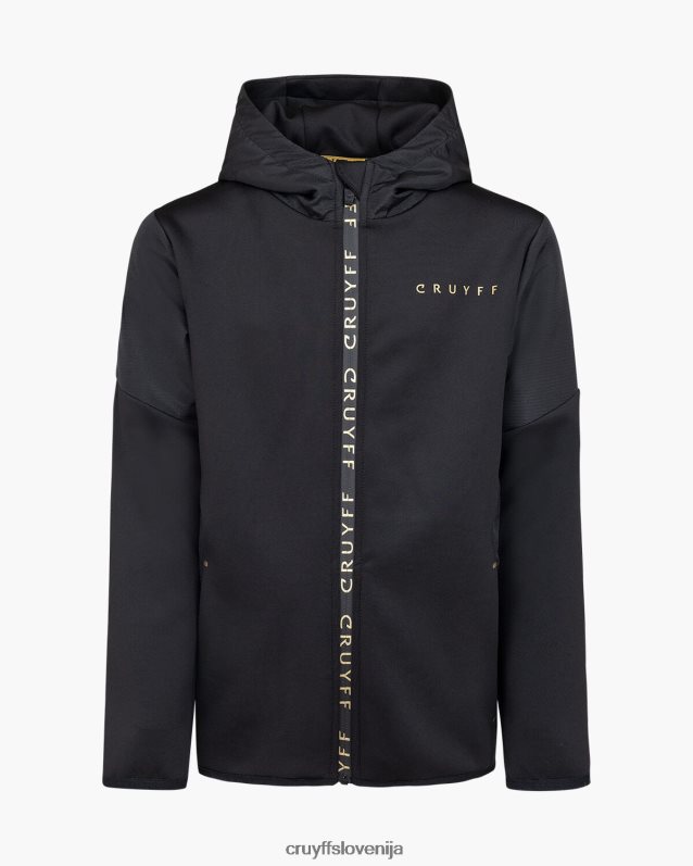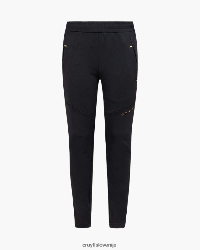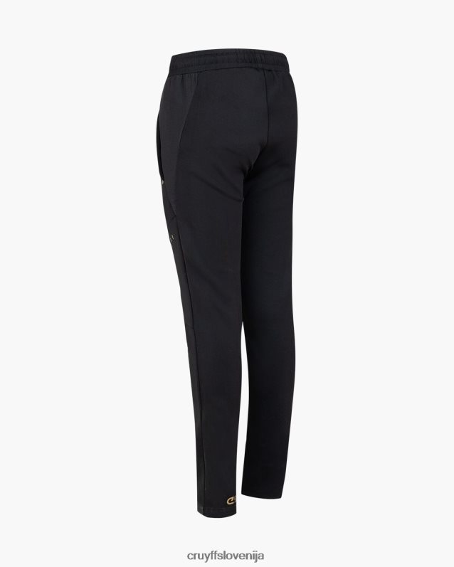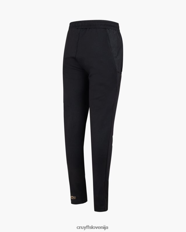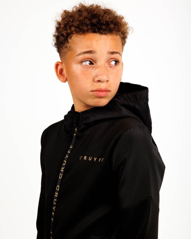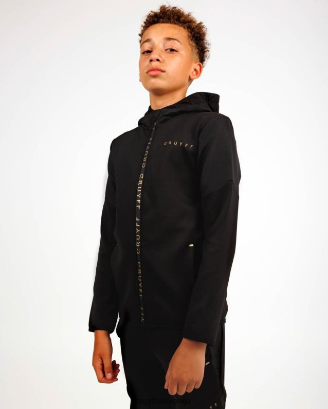 de cruyff cross suit for junior in het zwart met goud. een trainingspak voorzien van een normale pasvorm, gemaakt van zacht polyester potapljaški material. de zip-up top is voorzien van rib stop stof panelen op de mouwen, twee zijzakken met rits. de broek is ook voorzien van rib stop stof panelen en heeft twee zijzakken met rits. verrijkt met c-lion branding op de top en de broek.