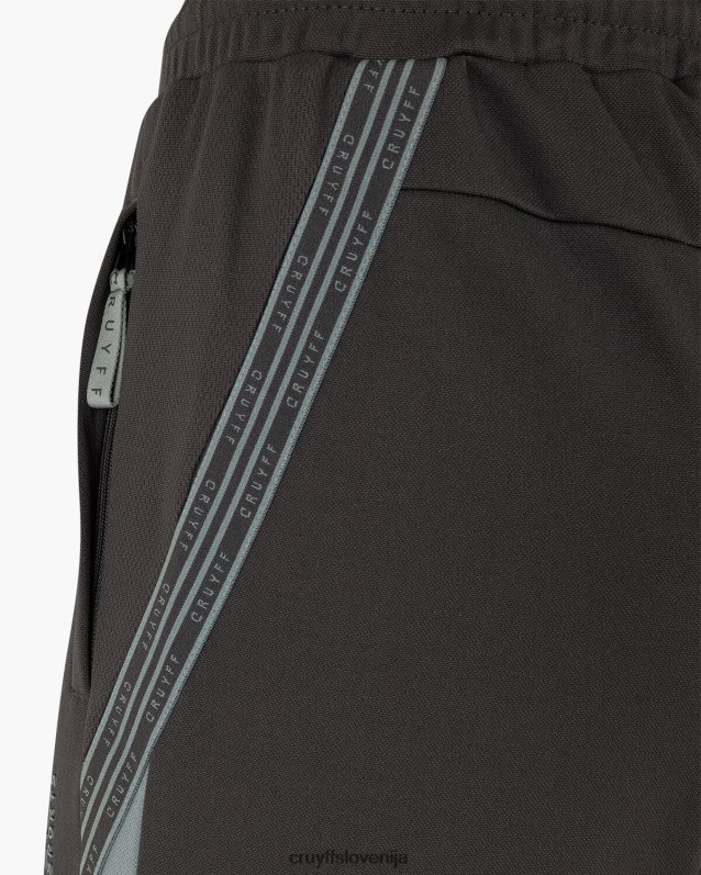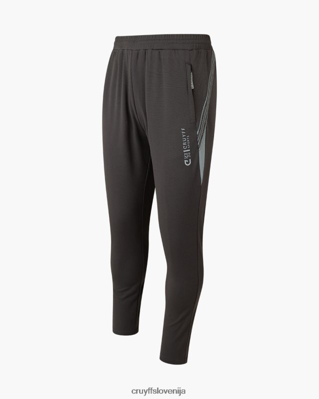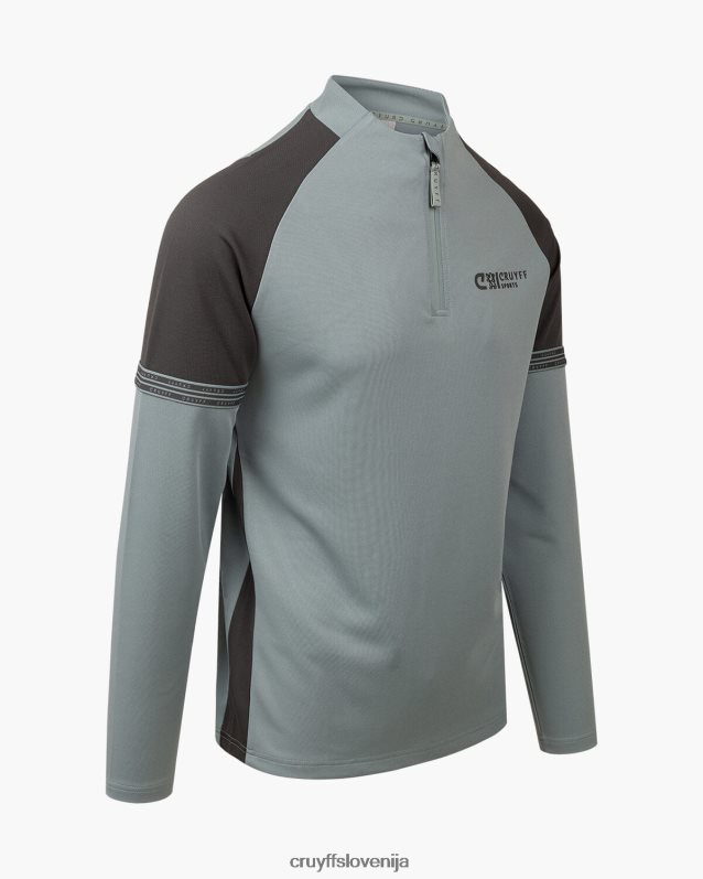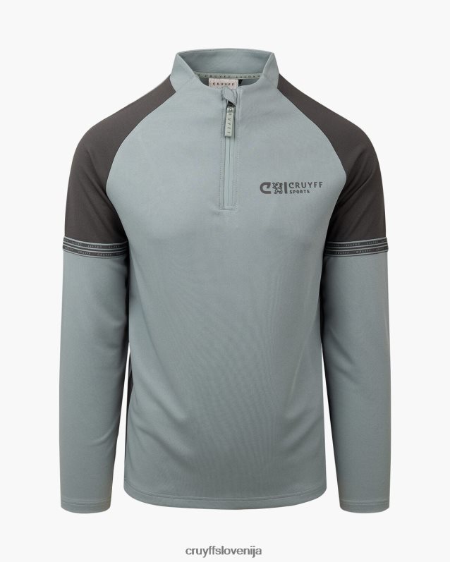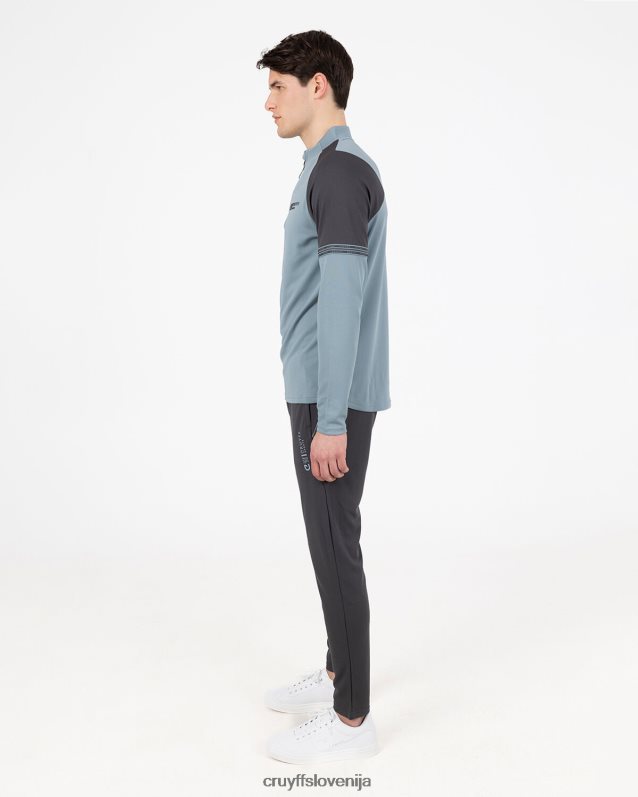 moška obleka cruyff v modri in sivi barvi. trenirka iz lahkega poliestra in oprijeta. zgornji del s polovično zadrgo ima športni pas cruyff okoli rok in črn športni logotip cruyff na levi strani prsi. trenirke imajo dva stranska žepa z zadrgo, elastičen pas z vrvicami in oprijete noge. obogaten z logotipom cruyff sport, trakom cruyff sport in kontrastnimi vložki ob nogah.