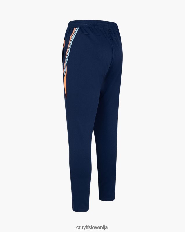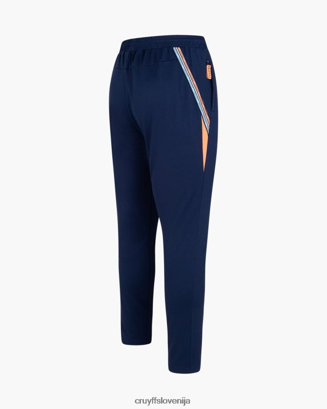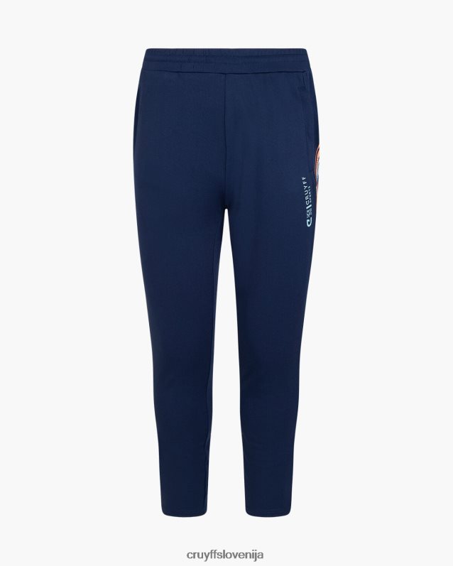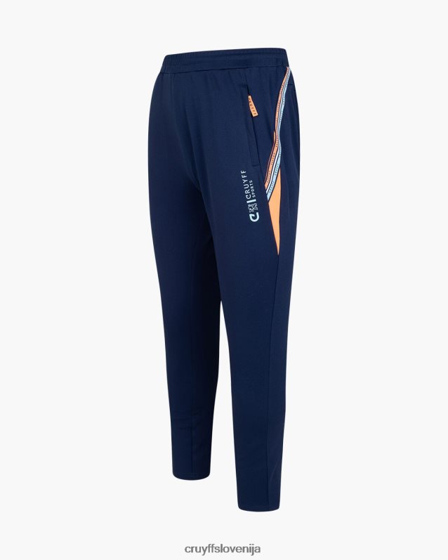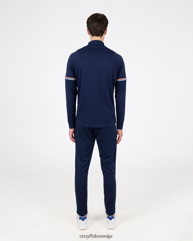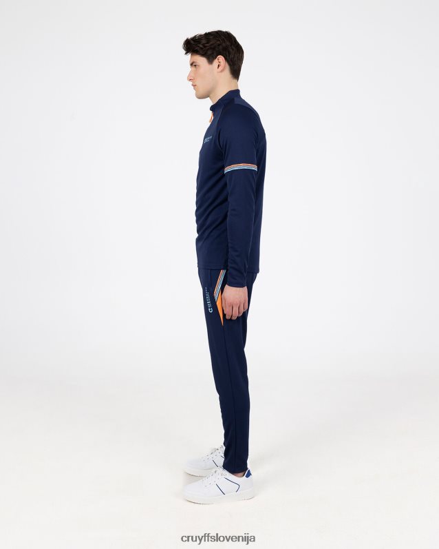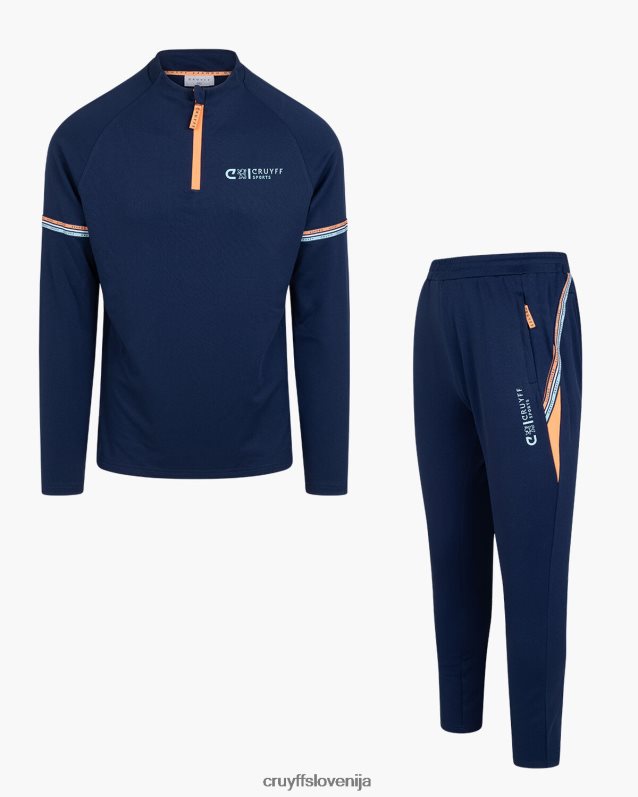 cruyff drsna obleka za moške v mornarsko modri barvi. trenirka iz lahkega poliestra in oprijeta. zgornji del s polovično zadrgo ima športni pas cruyff okoli rok in črn športni logotip cruyff na levi strani prsi. trenirke imajo dva stranska žepa z zadrgo, elastičen pas z vrvicami in oprijete noge. obogaten z logotipom cruyff sport, trakom cruyff sport in kontrastnimi vložki ob nogah.