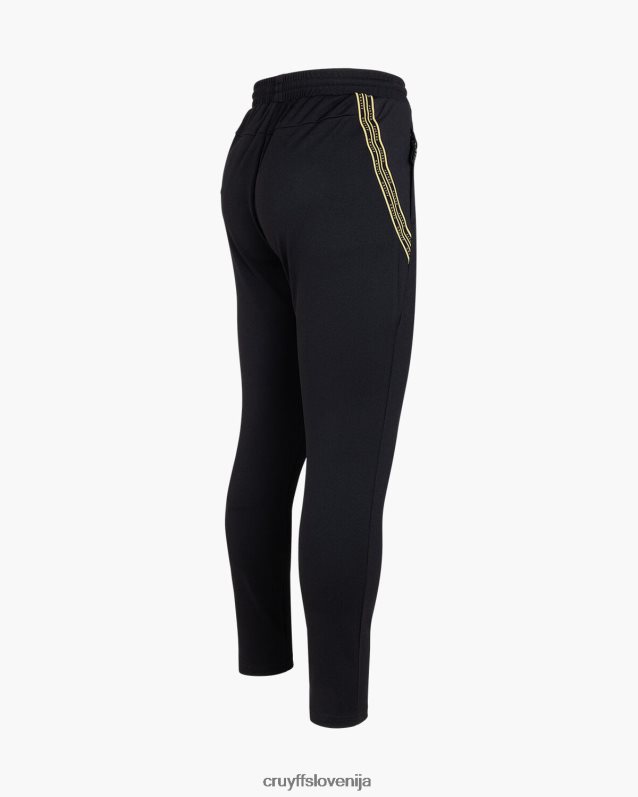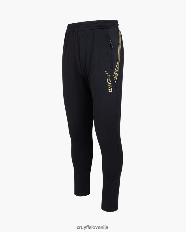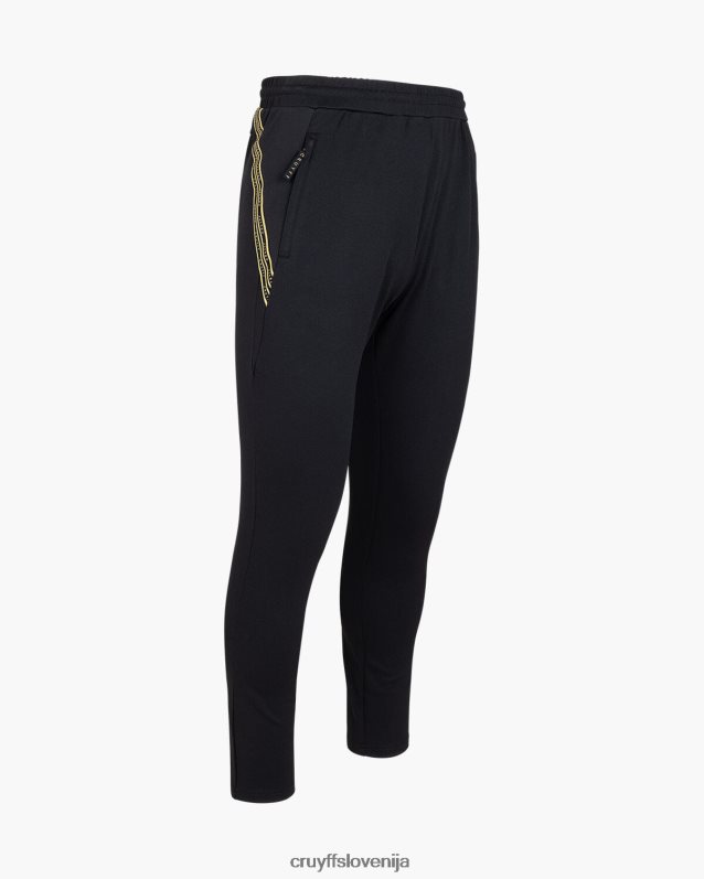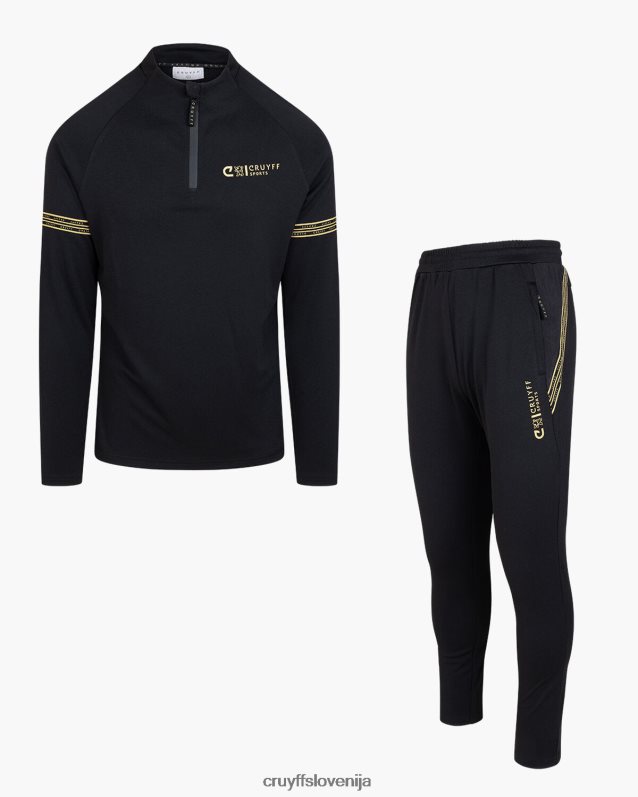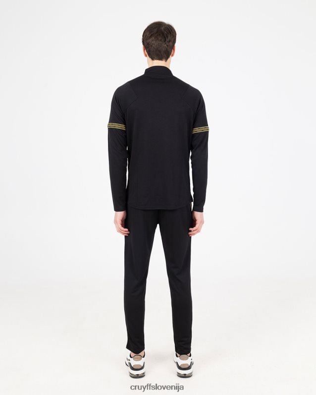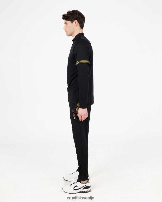 moška obleka cruyff slide v črni in zlati barvi. trenirka iz lahkega poliestra in oprijeta. zgornji del s polovično zadrgo ima športni pas cruyff okoli rok in črn športni logotip cruyff na levi strani prsi. trenirke imajo dva stranska žepa z zadrgo, elastičen pas z vrvicami in oprijete noge. obogaten z logotipom cruyff sport, trakom cruyff sport in kontrastnimi vložki ob nogah.