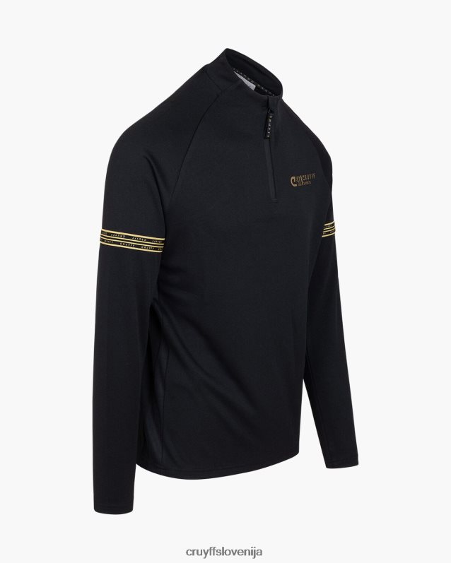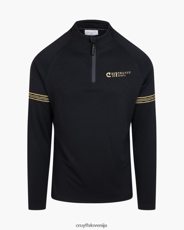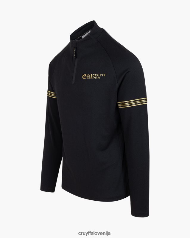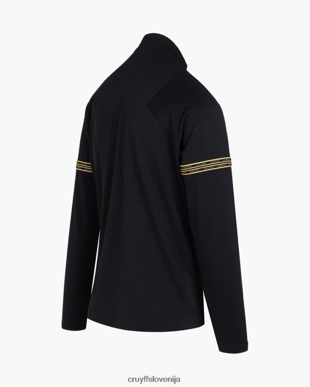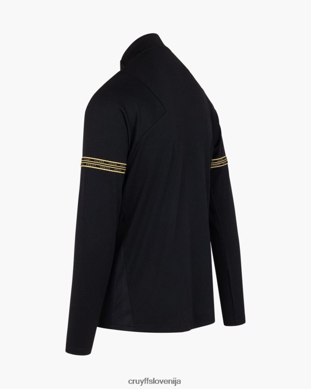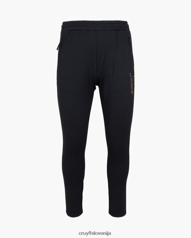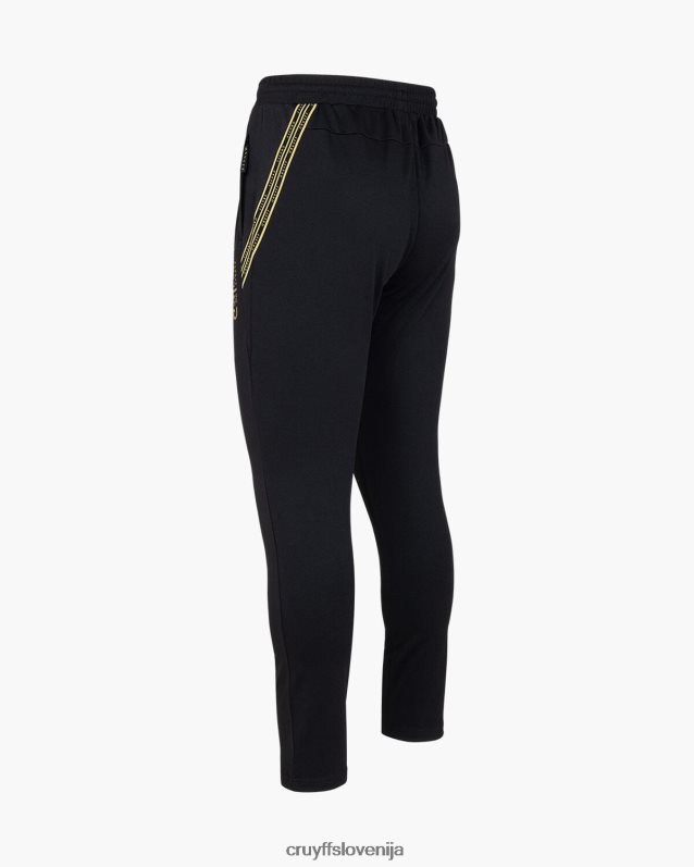 moška obleka cruyff slide v črni in zlati barvi. trenirka iz lahkega poliestra in oprijeta. zgornji del s polovično zadrgo ima športni pas cruyff okoli rok in črn športni logotip cruyff na levi strani prsi. trenirke imajo dva stranska žepa z zadrgo, elastičen pas z vrvicami in oprijete noge. obogaten z logotipom cruyff sport, trakom cruyff sport in kontrastnimi vložki ob nogah.