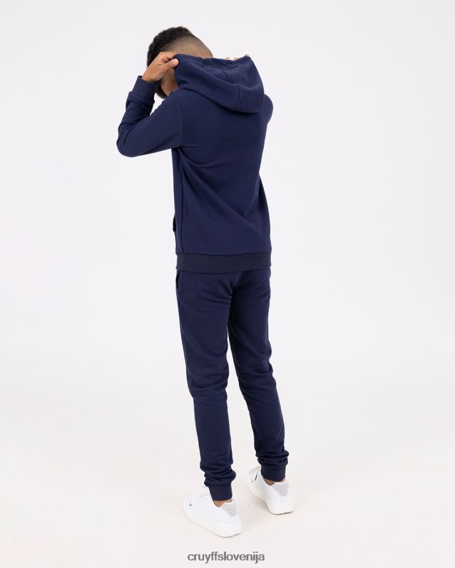 obleka cruyff do za mladince v mornarsko modri barvi. trenirka iz bombaža/poliestra in je običajnega kroja. pulover s kapuco ima kenguru žep in velik športni znak c-lion cruyff na prsih. hlače imajo vrvice v pasu, športno znamko c-lion cruyff in dva stranska žepa. 80% bombaž / 20% poliester
