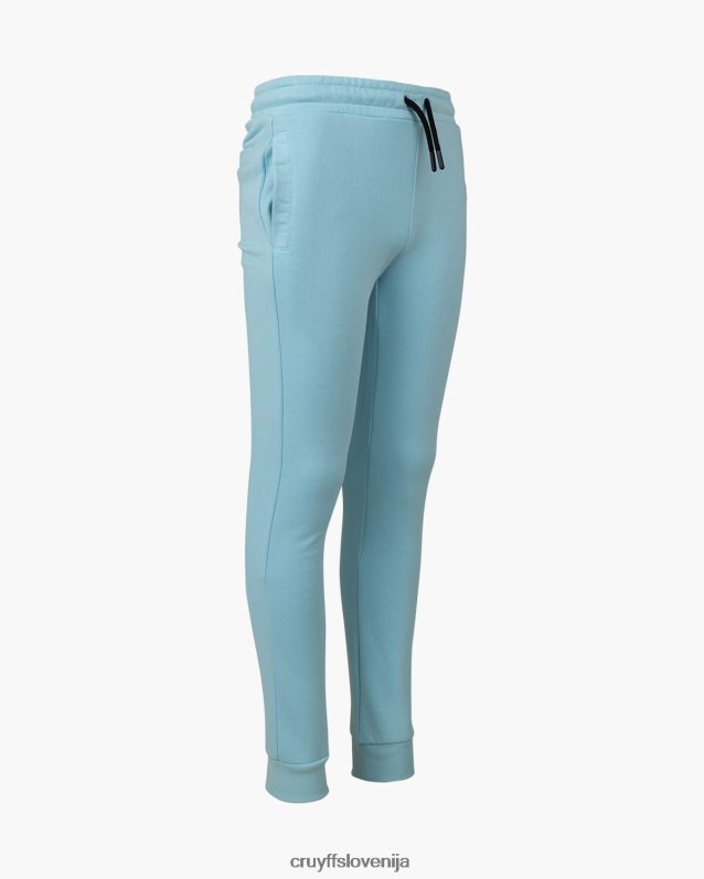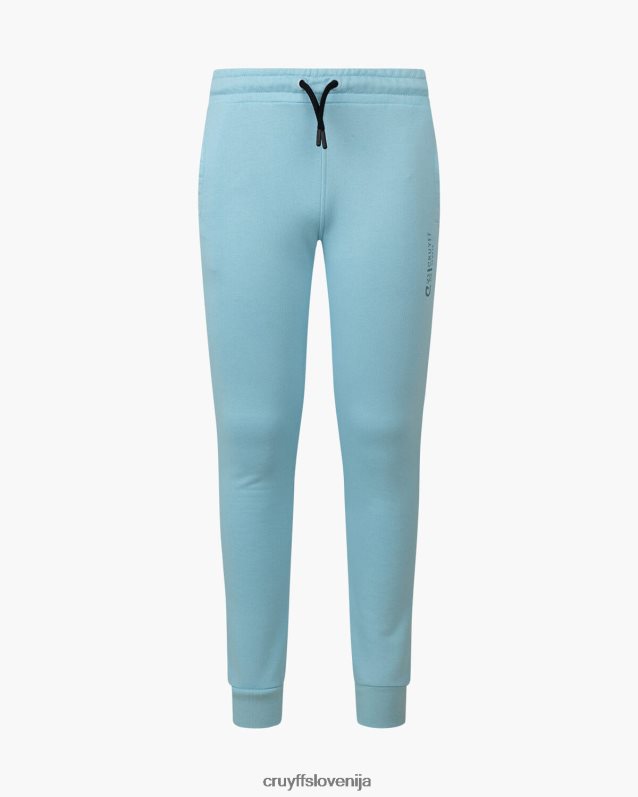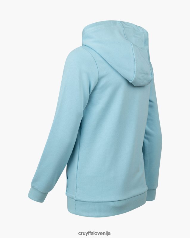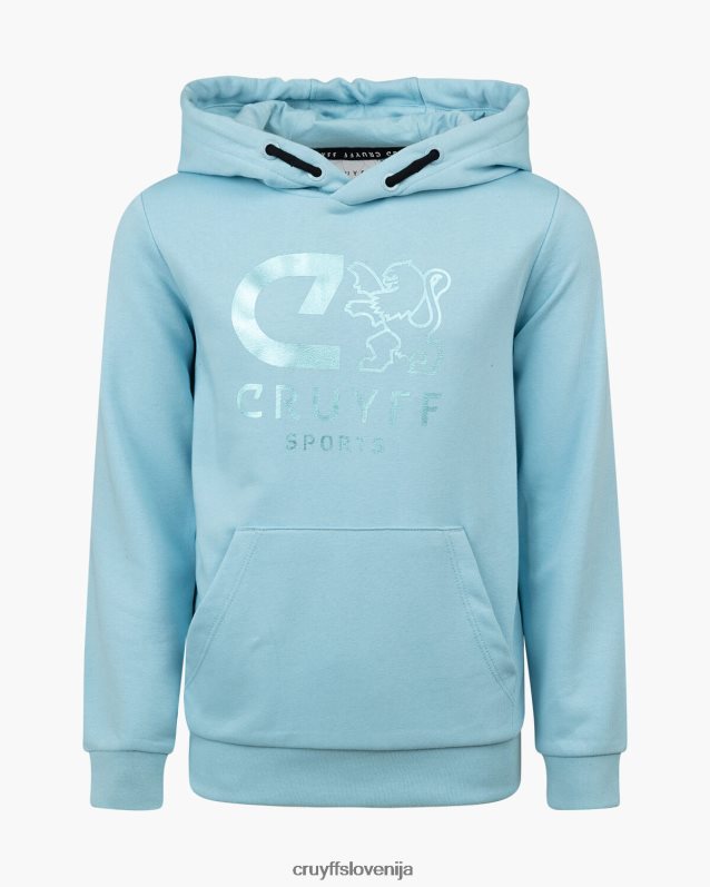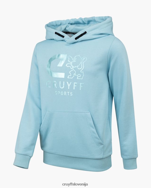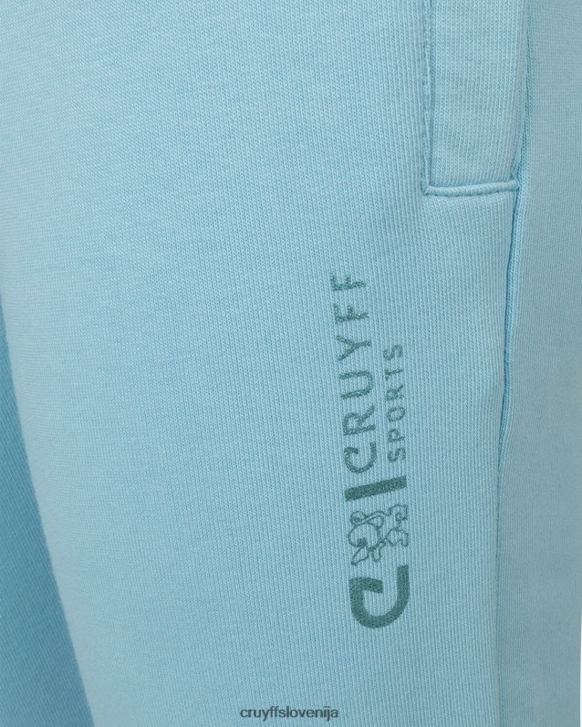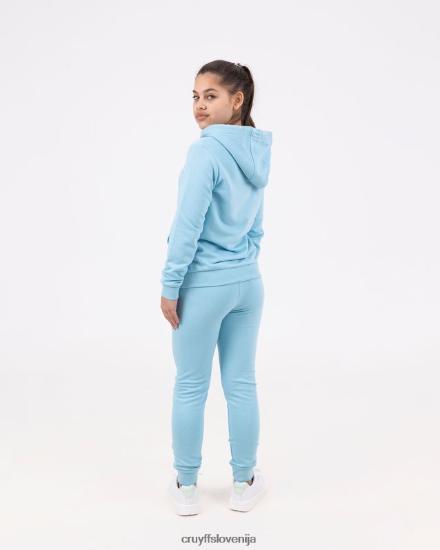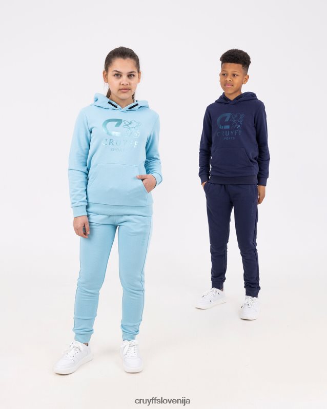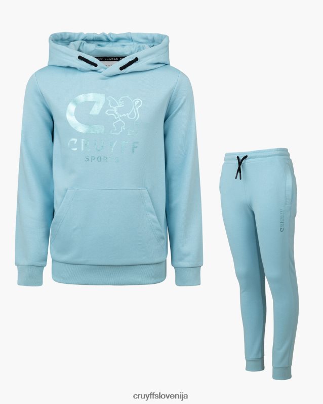 mladinska obleka cruyff do v nebesno modri barvi. trenirka iz bombaža/poliestra in je običajnega kroja. pulover s kapuco ima kenguru žep in velik športni znak c-lion cruyff na prsih. hlače imajo vrvice v pasu, športno znamko c-lion cruyff in dva stranska žepa. 80% bombaž / 20% poliester