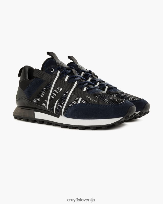 moške superge Cruyff Fearia v polnočno modri barvi. pohodniško navdahnjena superga, mešana z luksuznimi in športnimi elementi. nameščen na srednjem podplatu iz eva z neskončnim stabilizatorjem in podplatom po navdihu nogometa s šesterokotnimi čepki.